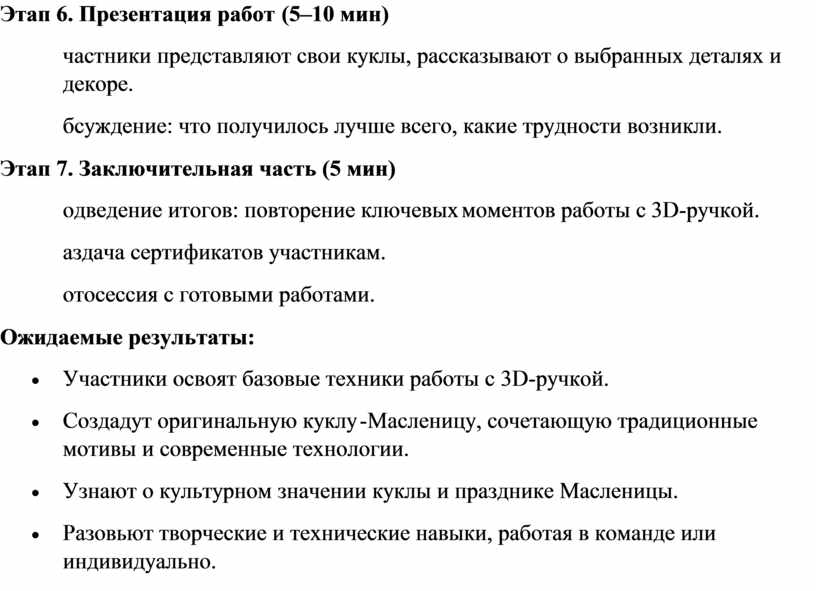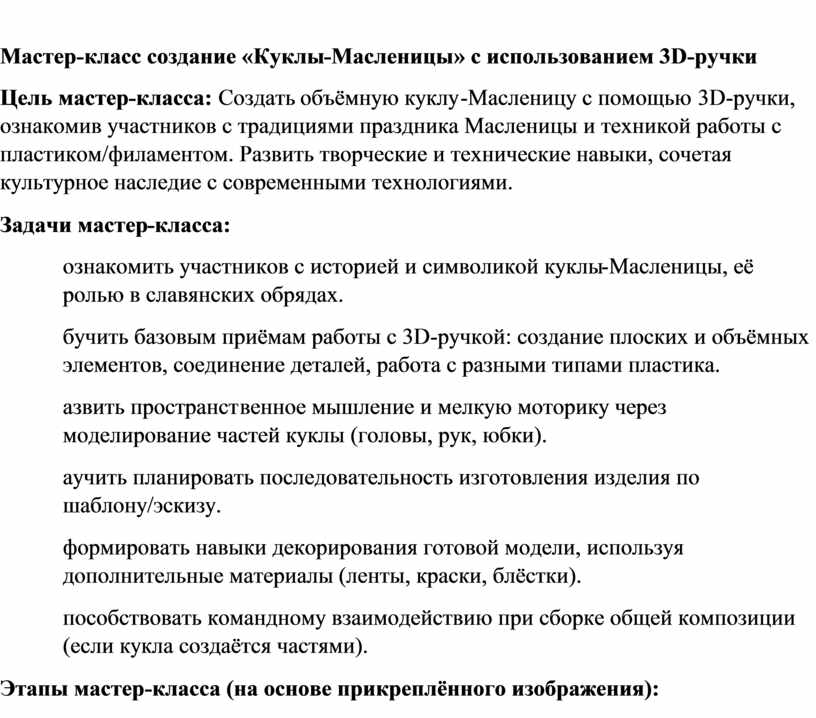 Цель мастер-класса: Создать объёмную куклу-Масленицу с помощью 3D-ручки, ознакомив участников с традициями праздника Масленицы и техникой работы с пластиком/филаментом. Развить творческие и технические навыки, сочетая культурное наследие с современными технологиями.