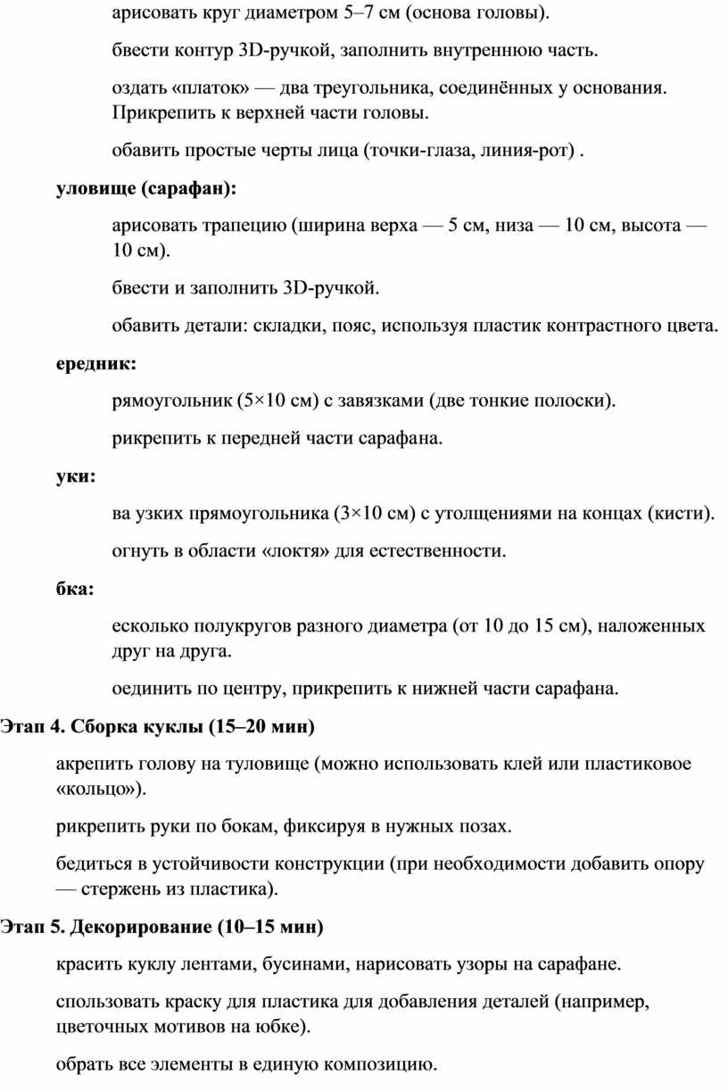 3. Развить пространственное мышление и мелкую моторику через моделирование частей куклы (головы, рук, юбки).