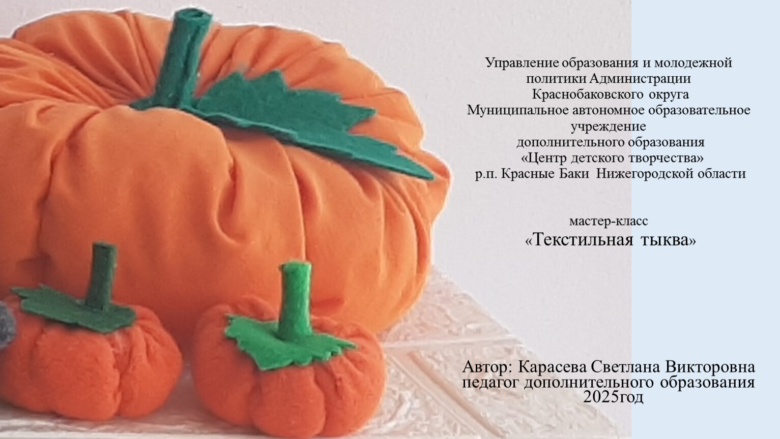 Управление образования и молодежной политики Администрации Краснобаковского округаМуниципальное автономное образовательное учреждение дополнительного образования «Центр детского творчества» р.п. Красные Баки Нижегородской областимастер-класс «Текстильная тыква»