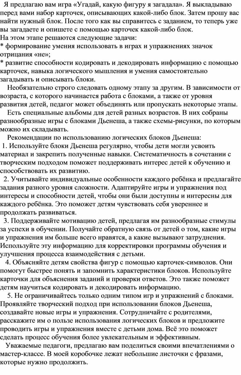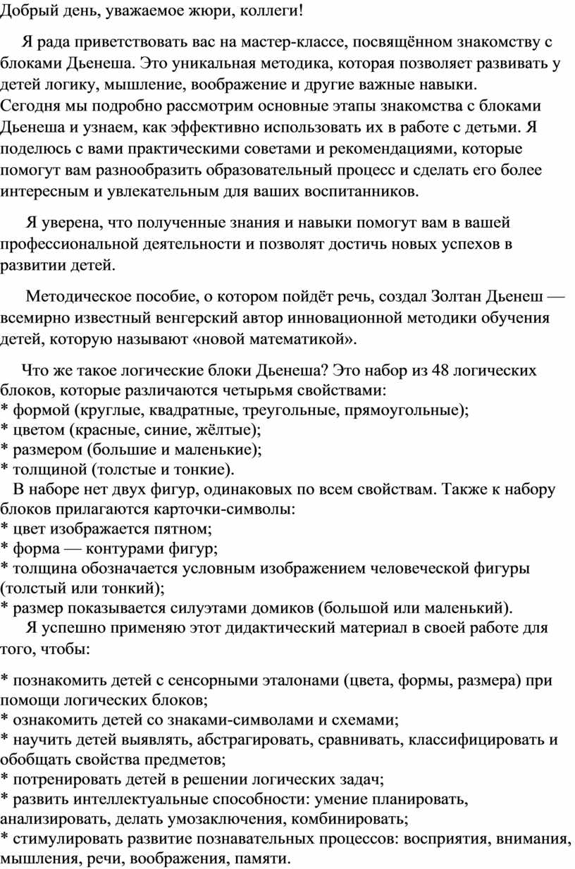 Я рада приветствовать вас на мастер-классе, посвящённом знакомству с блоками Дьенеша. Это уникальная методика, которая позволяет развивать у детей логику, мышление, воображение и другие важные навыки. Сегодня мы подробно рассмотрим основные этапы знакомства с блоками Дьенеша и узнаем, как эффективно использовать их в работе с детьми. Я поделюсь с вами практическими советами и рекомендациями, которые помогут вам разнообразить образовательный процесс и сделать его более интересным и увлекательным для ваших воспитанников.