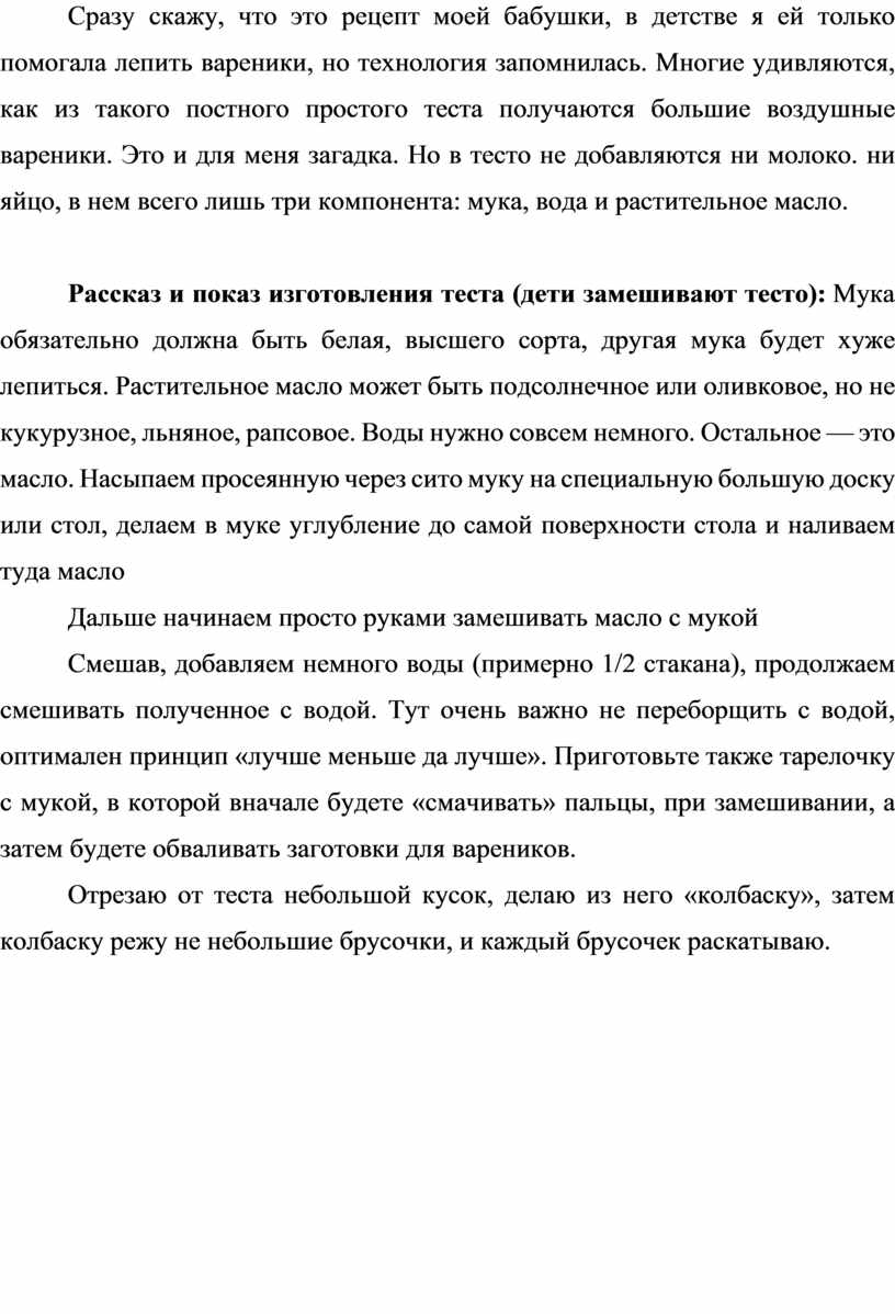 Рассказ и показ изготовления теста (дети замешивают тесто): Мука обязательно должна быть белая, высшего сорта, другая мука будет хуже лепиться. Растительное масло может быть подсолнечное или оливковое, но не кукурузное, льняное, рапсовое. Воды нужно совсем немного. Остальное — это масло. Насыпаем просеянную через сито муку на специальную большую доску или стол, делаем в муке углубление до самой поверхности стола и наливаем туда масло