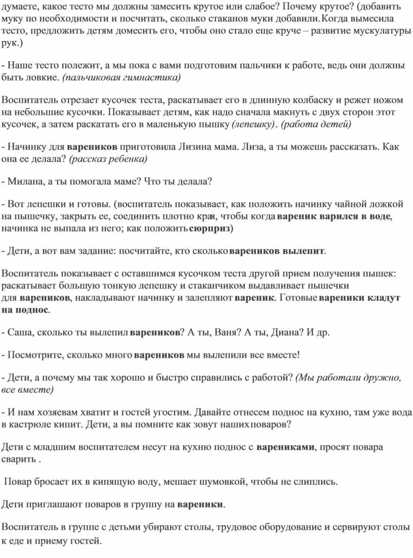 Задачи: Продолжать учить детей работать с тестом. Познакомить с новой технологией приготовления теста для лепки вареников с сюрпризами и продуктами, входящими в их состав, последовательность закладки этих продуктов, раскладывать начинку, залеплять края вареников, перегнув их пополам. Поддерживать интерес к данному виду деятельности. Воспитывать гостеприимство, доброту, заботу о людях, вызвать желание сделать приятное для них.