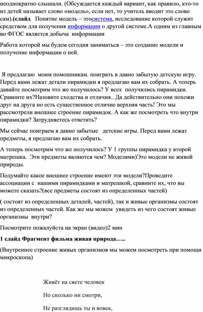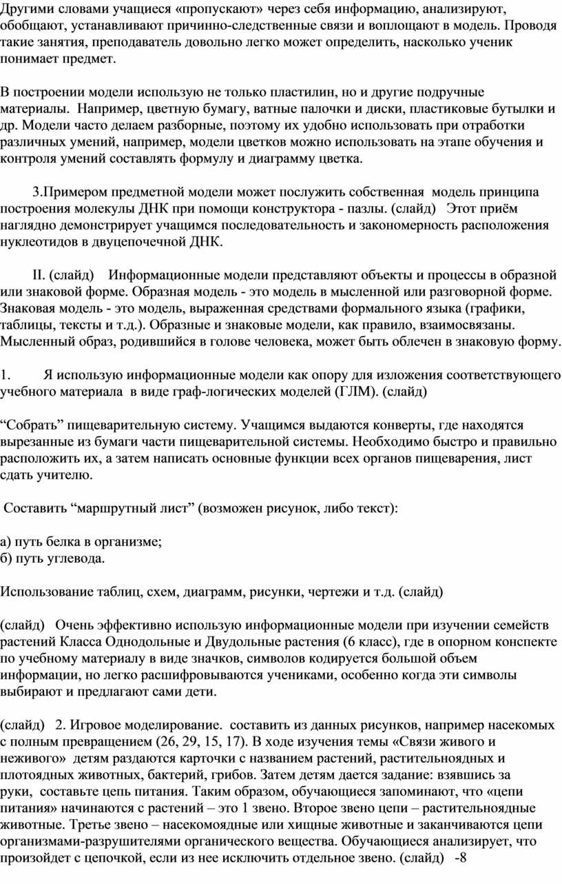 Возможностей для такого действенного овладения предметным моделированием в школьном курсе биологии немало. Приведем конкретные примеры использования и построения моделей на уроках биологии.