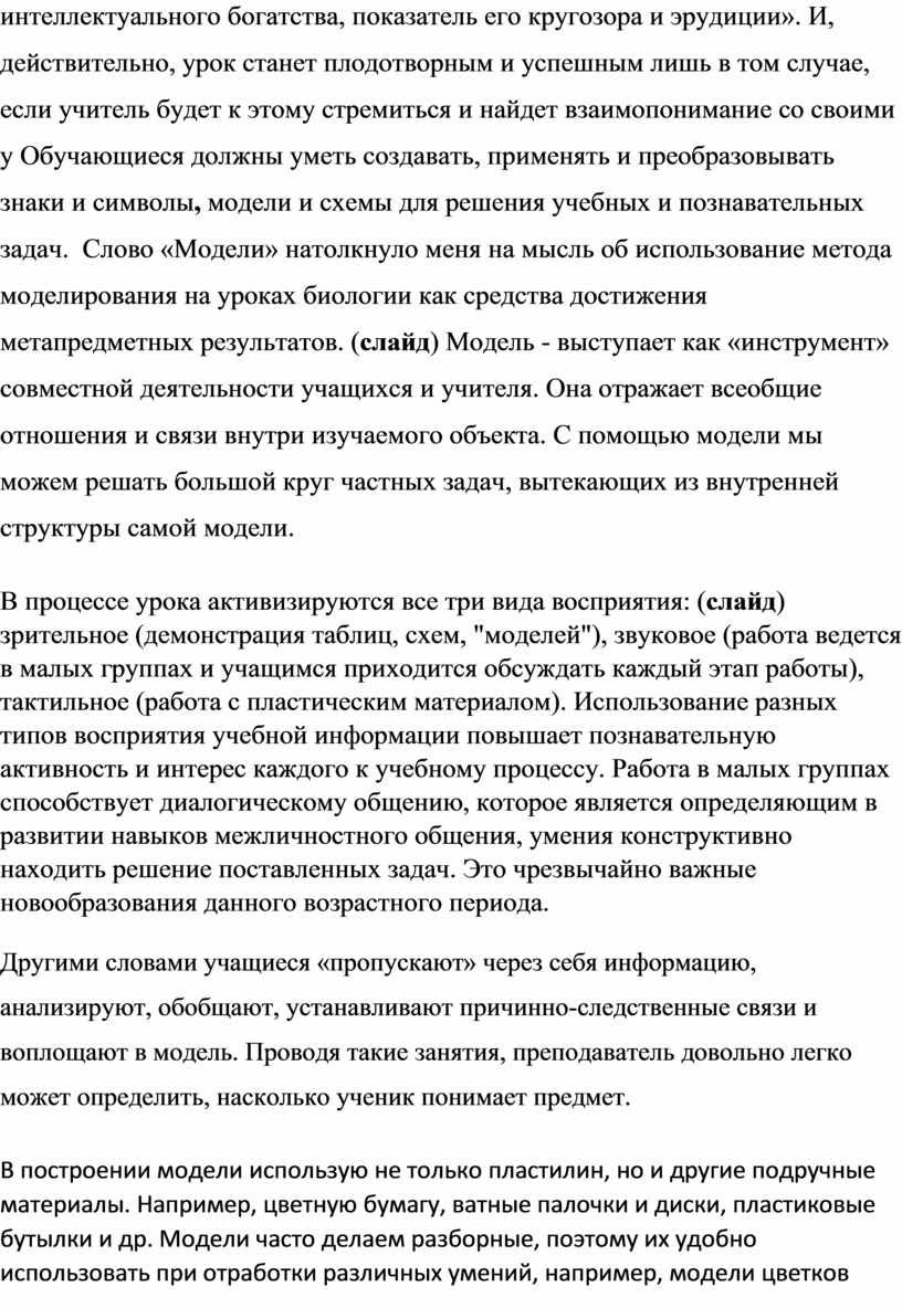 Начать хотелось бы со слов выдающегося ученого Н. Сухомлинского (слайд) « Урок- это зеркало общей и педагогической культуры учителя, мерило его интеллектуального богатства, показатель его кругозора и эрудиции». И, действительно, урок станет плодотворным и успешным лишь в том случае, если учитель будет к этому стремиться и найдет взаимопонимание со своими у Обучающиеся должны уметь создавать, применять и преобразовывать знаки и символы, модели и схемы для решения учебных и познавательных задач. Слово «Модели» натолкнуло меня на мысль об использование метода моделирования на уроках биологии как средства достижения метапредметных результатов. (слайд) Модель - выступает как «инструмент» совместной деятельности учащихся и учителя. Она отражает всеобщие отношения и связи внутри изучаемого объекта. С помощью модели мы можем решать большой круг частных задач, вытекающих из внутренней структуры самой модели.