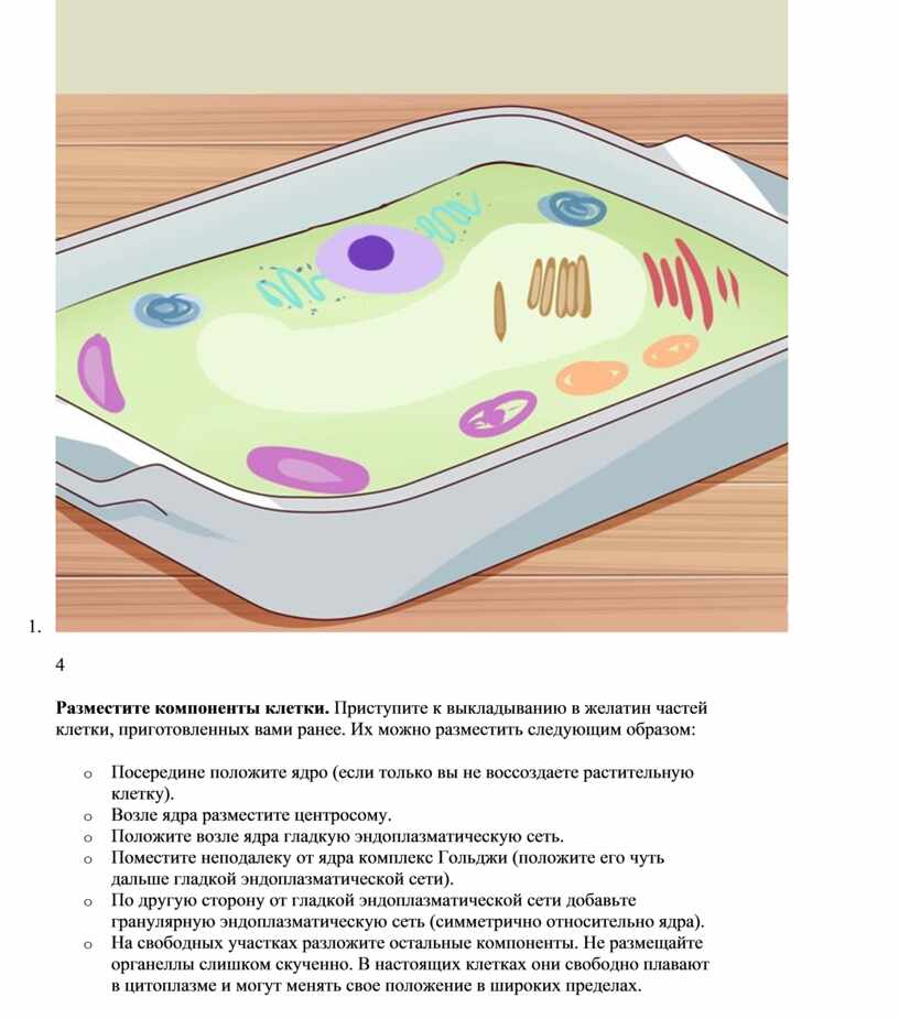 Разместите компоненты клетки. Приступите к выкладыванию в желатин частей клетки, приготовленных вами ранее. Их можно разместить следующим образом: