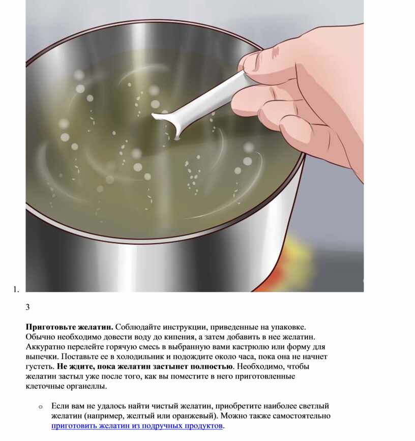 Приготовьте желатин. Соблюдайте инструкции, приведенные на упаковке. Обычно необходимо довести воду до кипения, а затем добавить в нее желатин. Аккуратно перелейте горячую смесь в выбранную вами кастрюлю или форму для выпечки. Поставьте ее в холодильник и подождите около часа, пока она не начнет густеть. Не ждите, пока желатин застынет полностью. Необходимо, чтобы желатин застыл уже после того, как вы поместите в него приготовленные клеточные органеллы.
