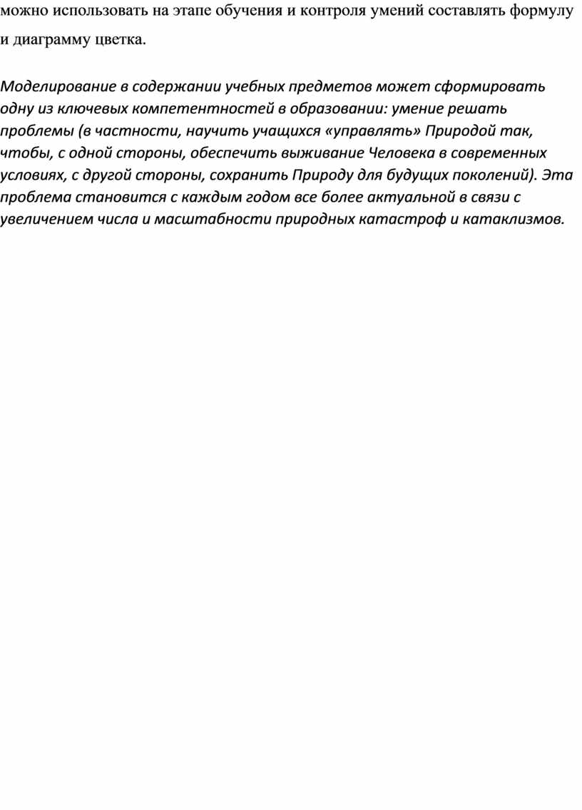 Моделирование в содержании учебных предметов может сформировать одну из ключевых компетентностей в образовании: умение решать проблемы (в частности, научить учащихся «управлять» Природой так, чтобы, с одной стороны, обеспечить выживание Человека в современных условиях, с другой стороны, сохранить Природу для будущих поколений). Эта проблема становится с каждым годом все более актуальной в связи с увеличением числа и масштабности природных катастроф и катаклизмов.