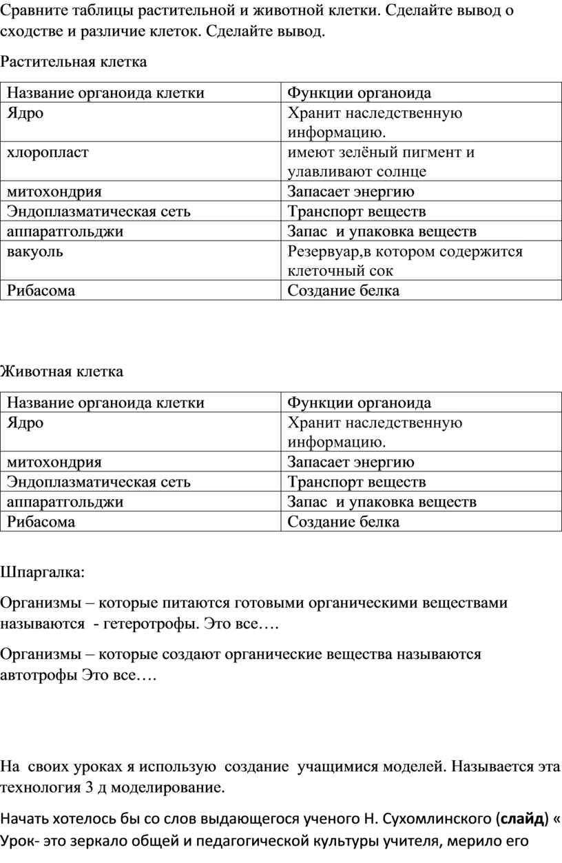 Сравните таблицы растительной и животной клетки. Сделайте вывод о сходстве и различие клеток. Сделайте вывод.