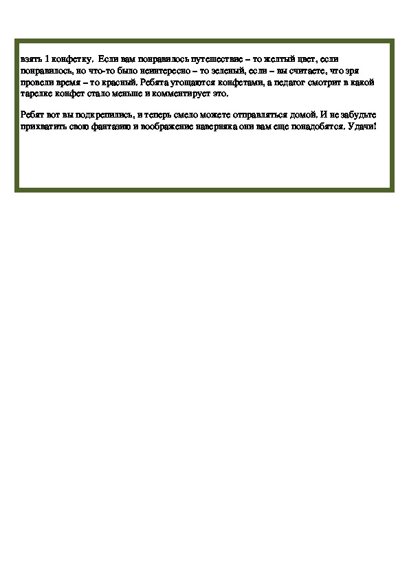Перед вами 3 тарелки с конфетами (красный, желтый, зеленый цвет). Каждому можновзять 1 конфетку. Если вам понравилось путешествие – то желтый цвет, если