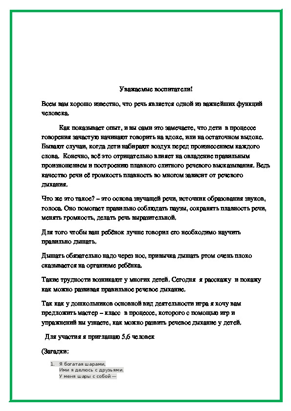 Задачи: Познакомить воспитателей с понятием «речевое дыхание».