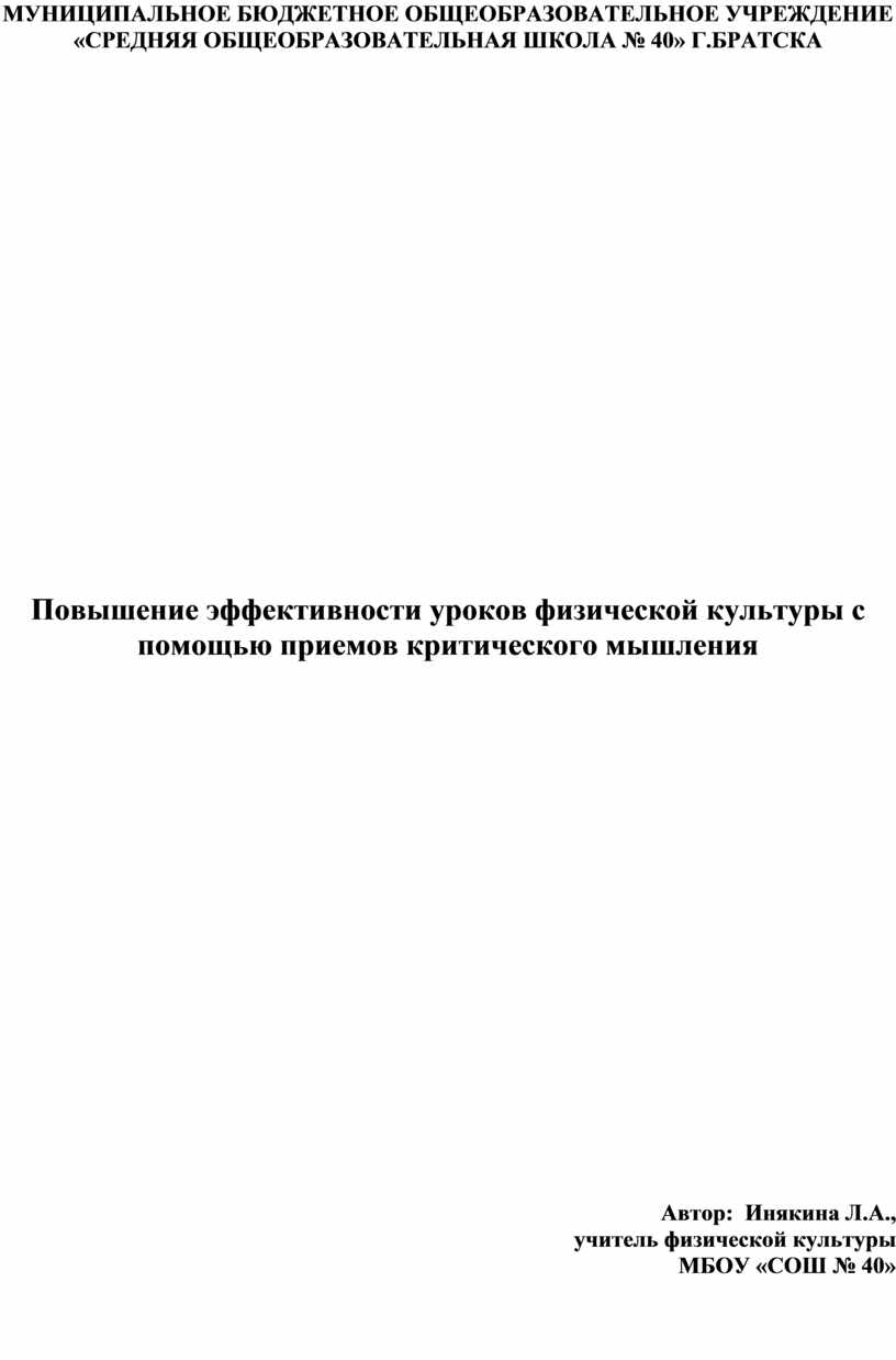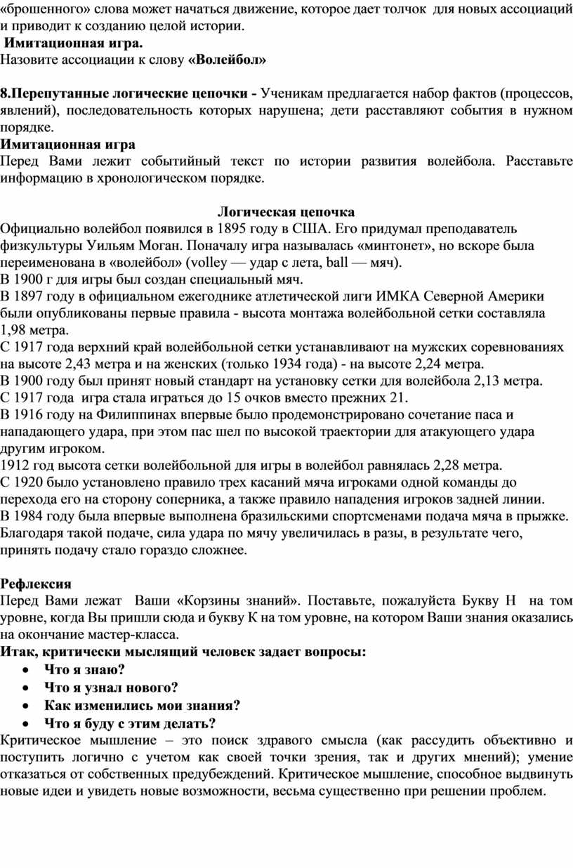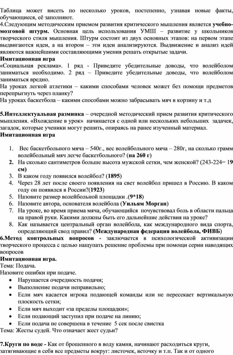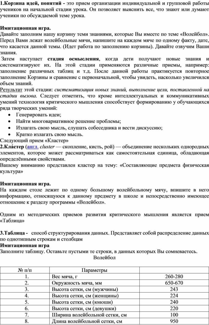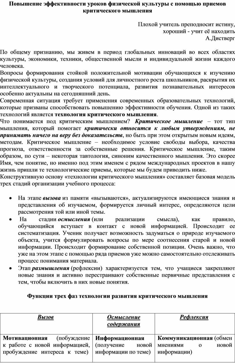 Повышение эффективности уроков физической культуры с помощью приемов критического мышления