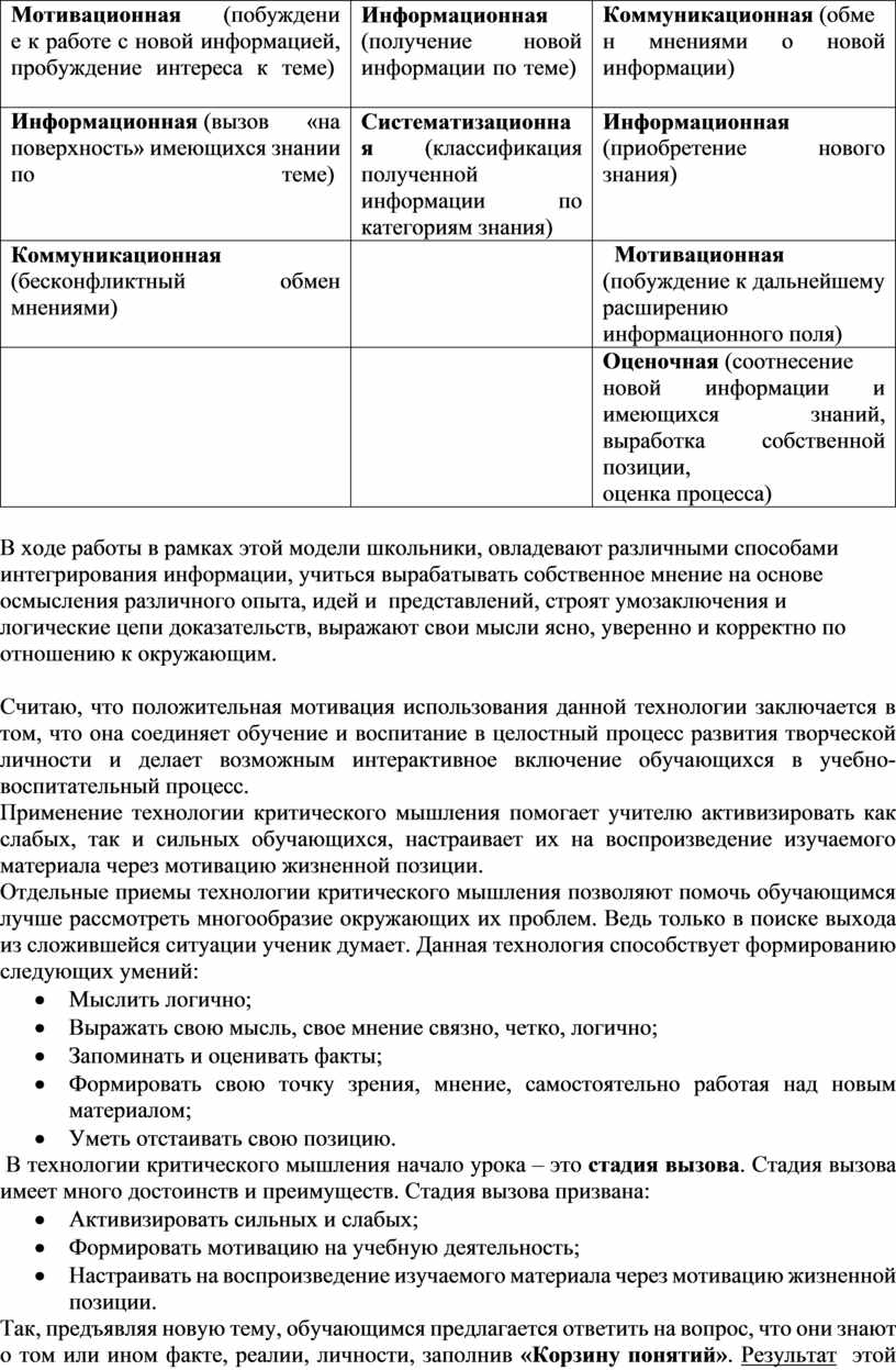 Применение технологии критического мышления помогает учителю активизировать как слабых, так и сильных обучающихся, настраивает их на воспроизведение изучаемого материала через мотивацию жизненной позиции.
