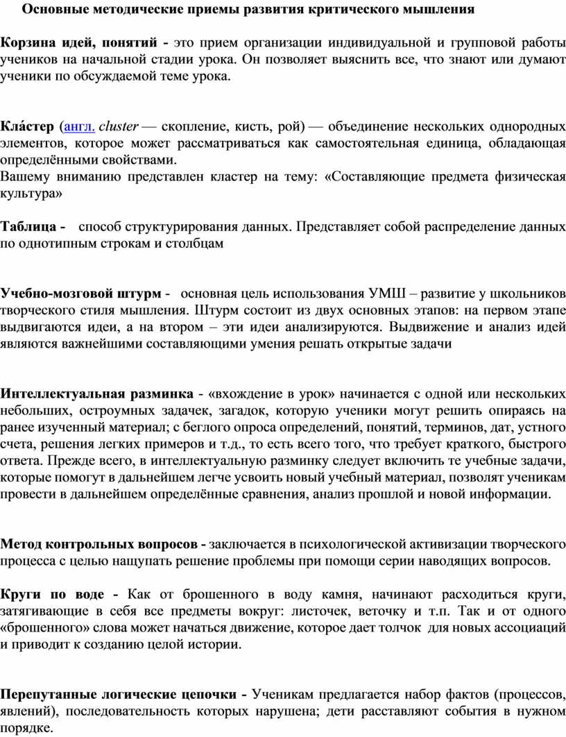 Основные методические приемы развития критического мышления