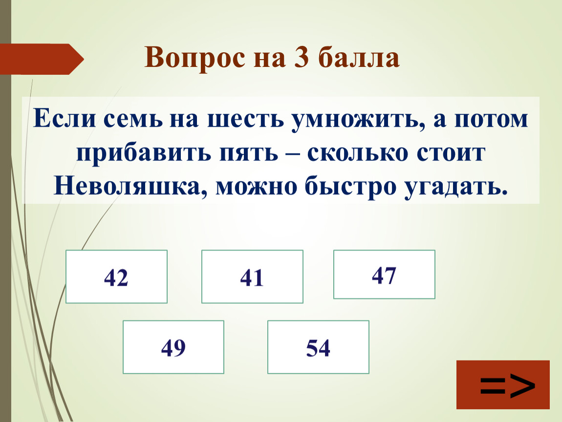 Если семь на шесть умножить, а потом прибавить пять – сколько стоит Неволяшка, можно быстро угадать.