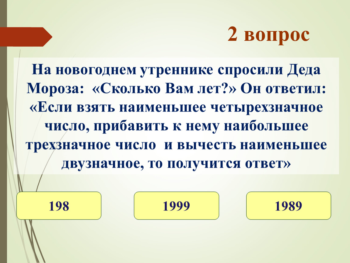 На новогоднем утреннике спросили Деда Мороза: «Сколько Вам лет?» Он ответил: «Если взять наименьшее четырехзначное число, прибавить к нему наибольшее трехзначное число и вычесть наименьшее двузначное, то получится ответ»