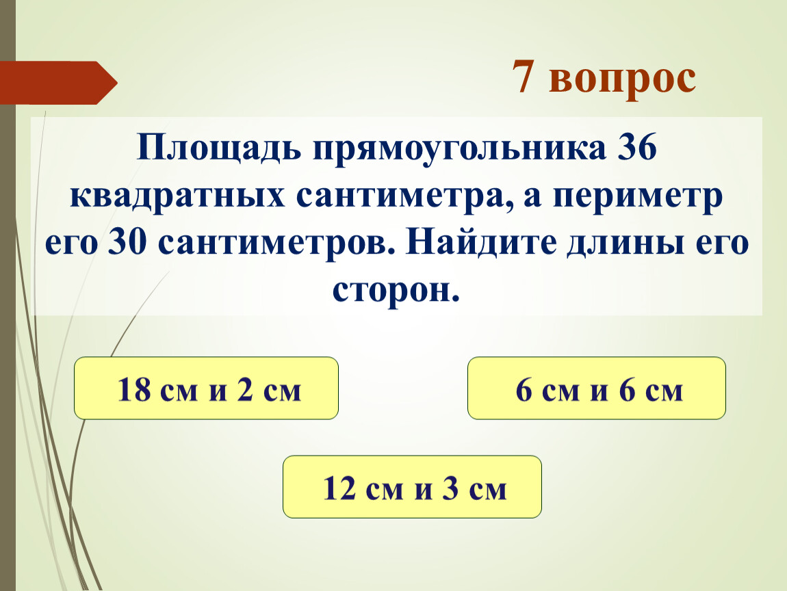 Площадь прямоугольника 36 квадратных сантиметра, а периметр его 30 сантиметров. Найдите длины его сторон.