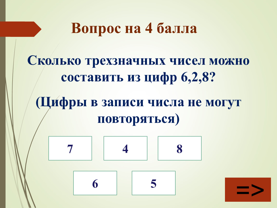 Сколько трехзначных чисел можно составить из цифр 6,2,8?