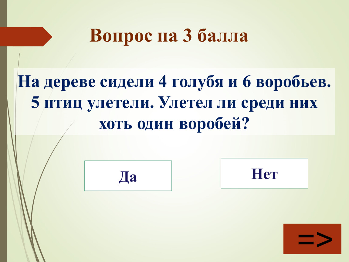На дереве сидели 4 голубя и 6 воробьев. 5 птиц улетели. Улетел ли среди них хоть один воробей?