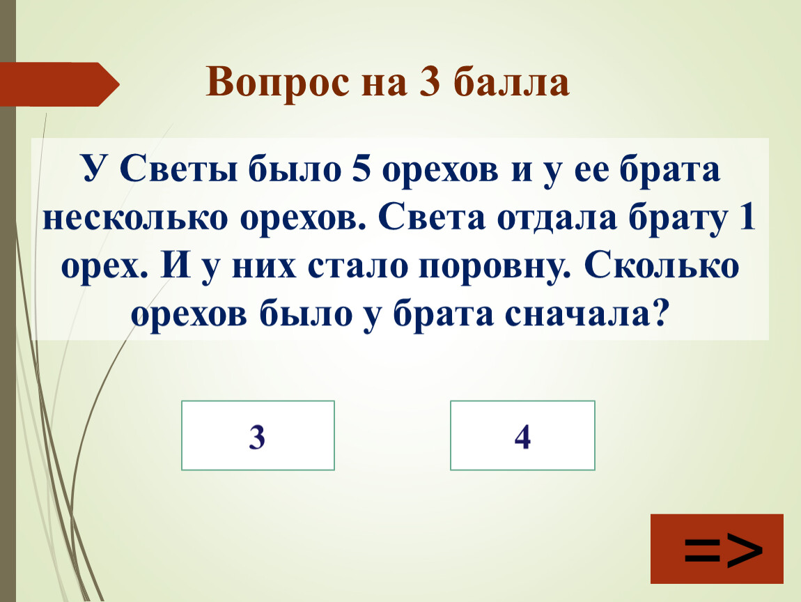 У Светы было 5 орехов и у ее брата несколько орехов. Света отдала брату 1 орех. И у них стало поровну. Сколько орехов было у брата сначала?