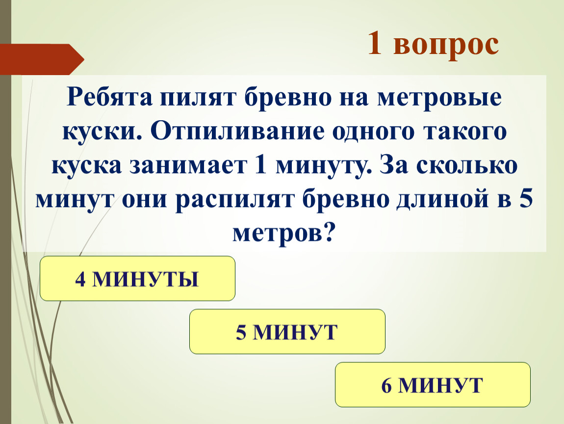 Ребята пилят бревно на метровые куски. Отпиливание одного такого куска занимает 1 минуту. За сколько минут они распилят бревно длиной в 5 метров?