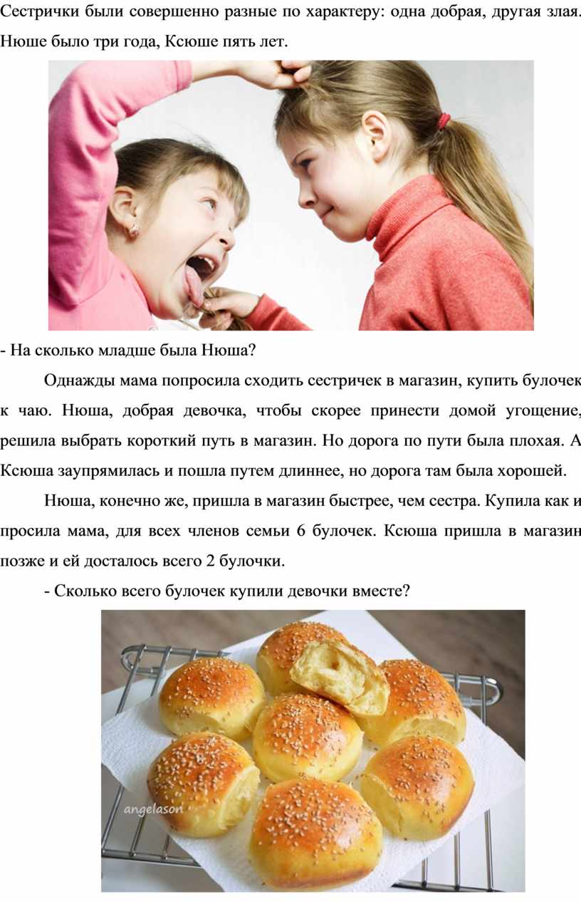 Нюша, конечно же, пришла в магазин быстрее, чем сестра. Купила как и просила мама, для всех членов семьи 6 булочек. Ксюша пришла в магазин позже и ей досталось всего 2 булочки.