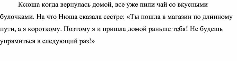 Ксюша когда вернулась домой, все уже пили чай со вкусными булочками. На что Нюша сказала сестре: «Ты пошла в магазин по длинному пути, а я короткому. Поэтому я и пришла домой раньше тебя! Не будешь упрямиться в следующий раз!»