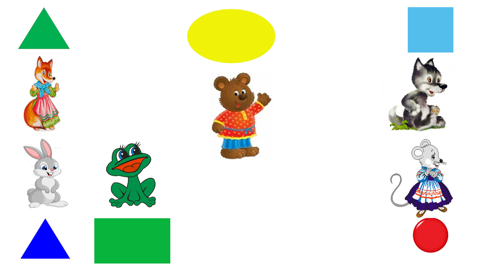 Круг- желтый; квадрат- синий; треугольник-зеленый, прямоугольник-розовый, овал- оранжевый.