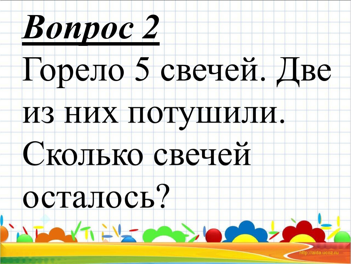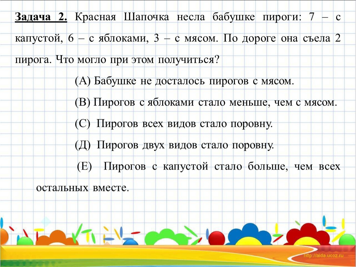 Задача 2. Красная Шапочка несла бабушке пироги: 7 – с капустой, 6 – с яблоками, 3 – с мясом. По дороге она съела 2 пирога. Что могло при этом получиться?
