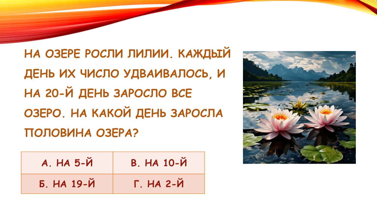 На озере росли лилии. Каждый день их число удваивалось, и на 20-й день заросло все озеро. На какой день заросла половина озера?
