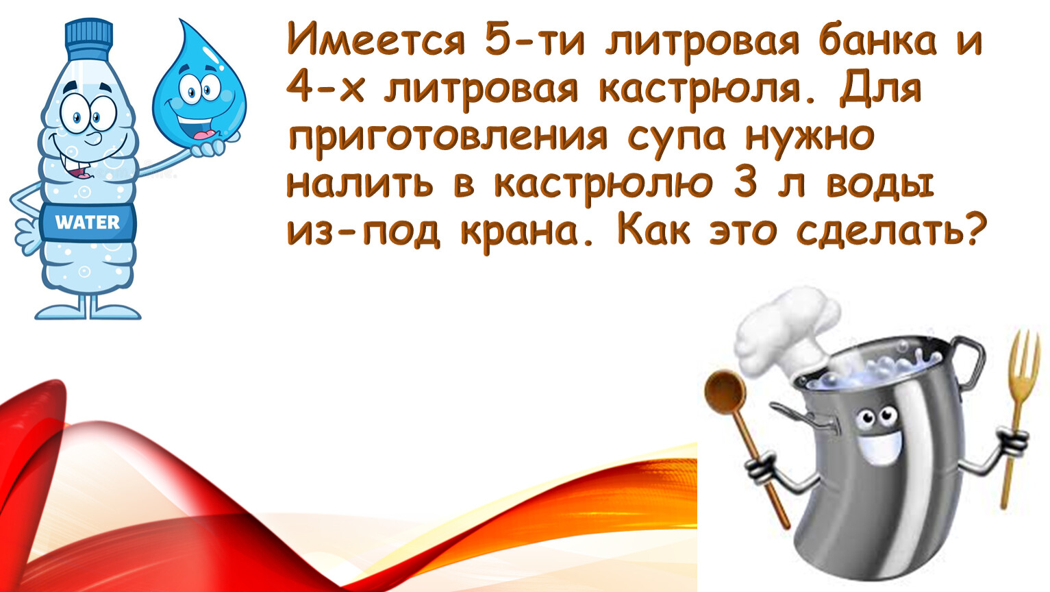 Имеется 5-ти литровая банка и 4-х литровая кастрюля. Для приготовления супа нужно налить в кастрюлю 3 л воды из-под крана. Как это сделать?