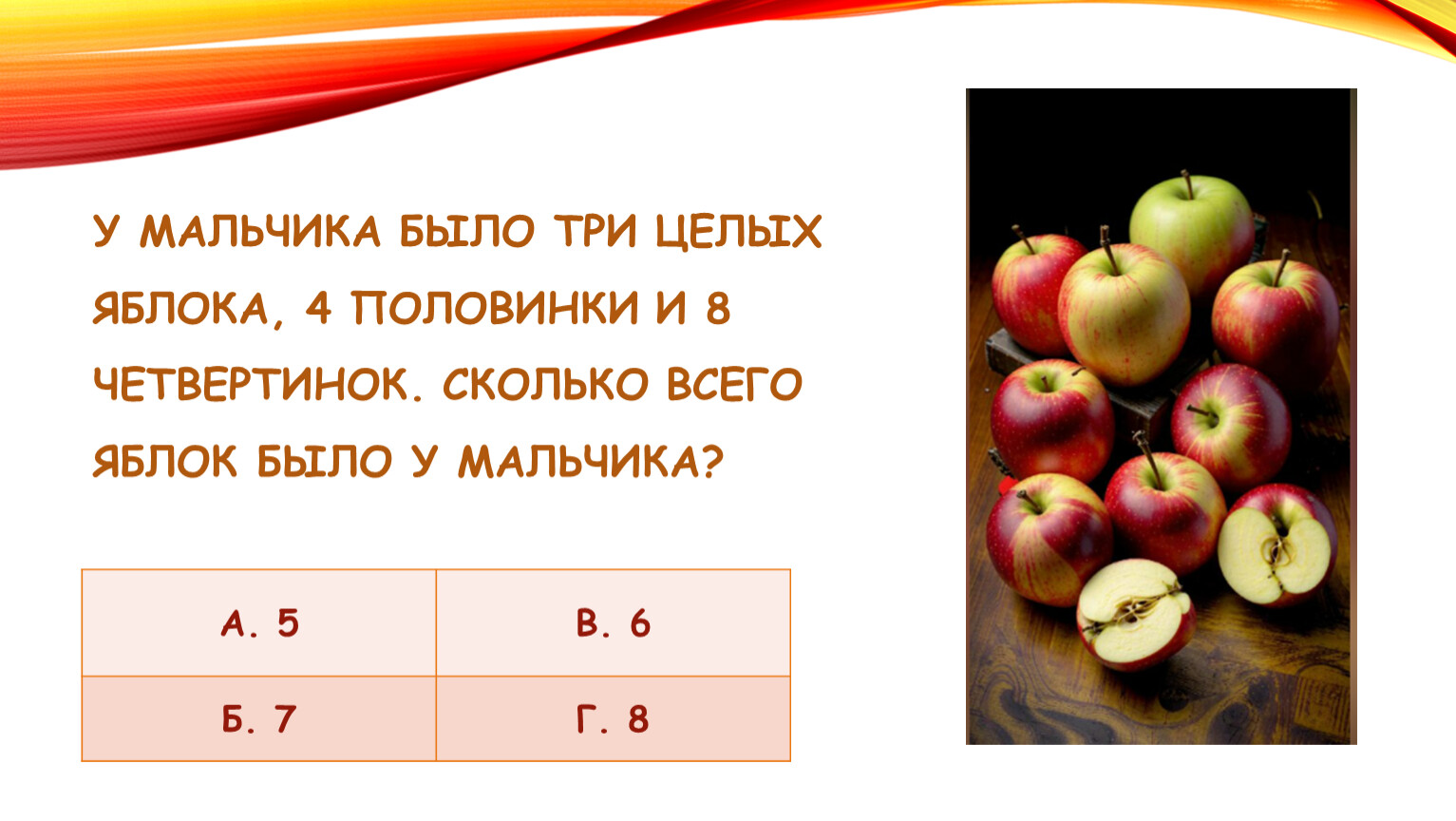 У мальчика было три целых яблока, 4 половинки и 8 четвертинок. Сколько всего яблок было у мальчика?
