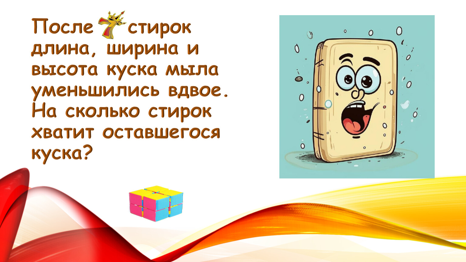 После стирок длина, ширина и высота куска мыла уменьшились вдвое. На сколько стирок хватит оставшегося куска?
