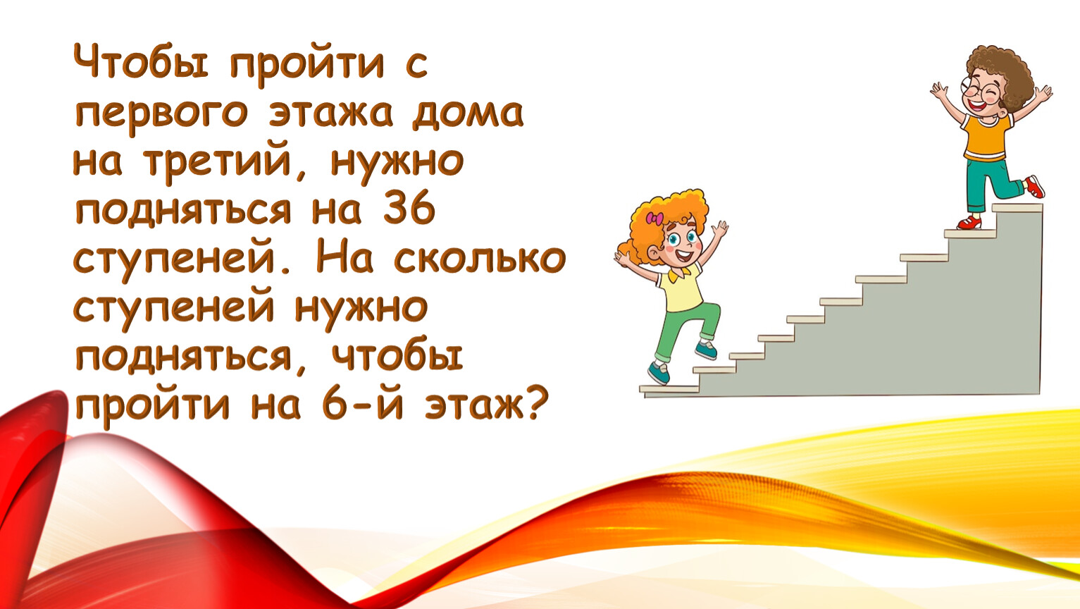 Чтобы пройти с первого этажа дома на третий, нужно подняться на 36 ступеней. На сколько ступеней нужно подняться, чтобы пройти на 6-й этаж?