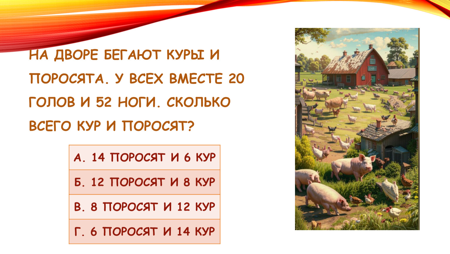 На дворе бегают куры и поросята. У всех вместе 20 голов и 52 ноги. Сколько всего кур и поросят?