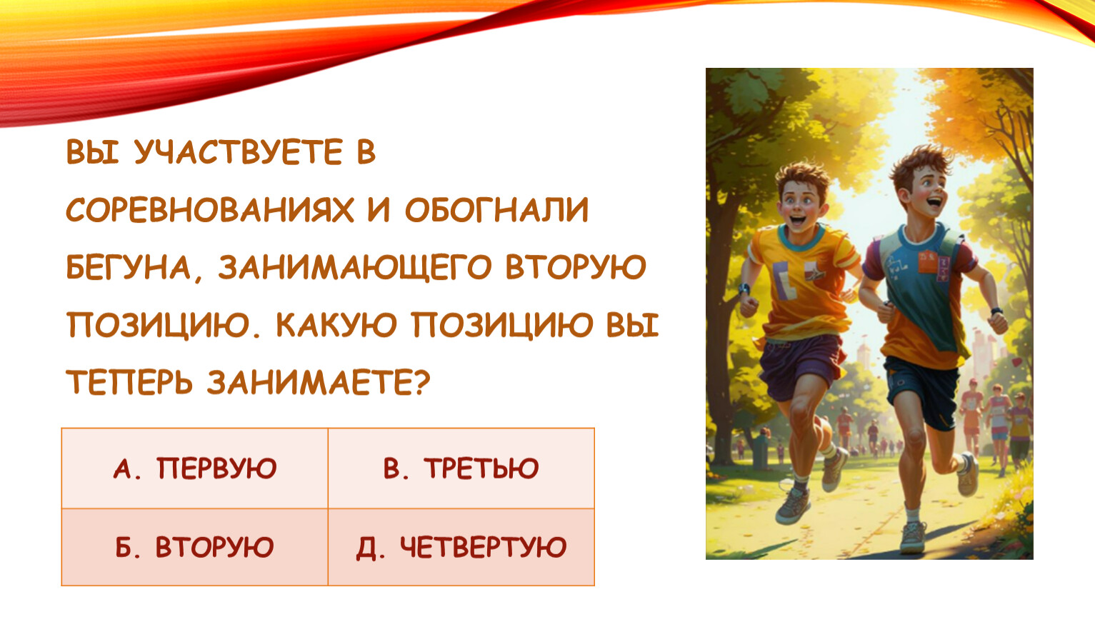 Вы участвуете в соревнованиях и обогнали бегуна, занимающего вторую позицию. Какую позицию вы теперь занимаете?