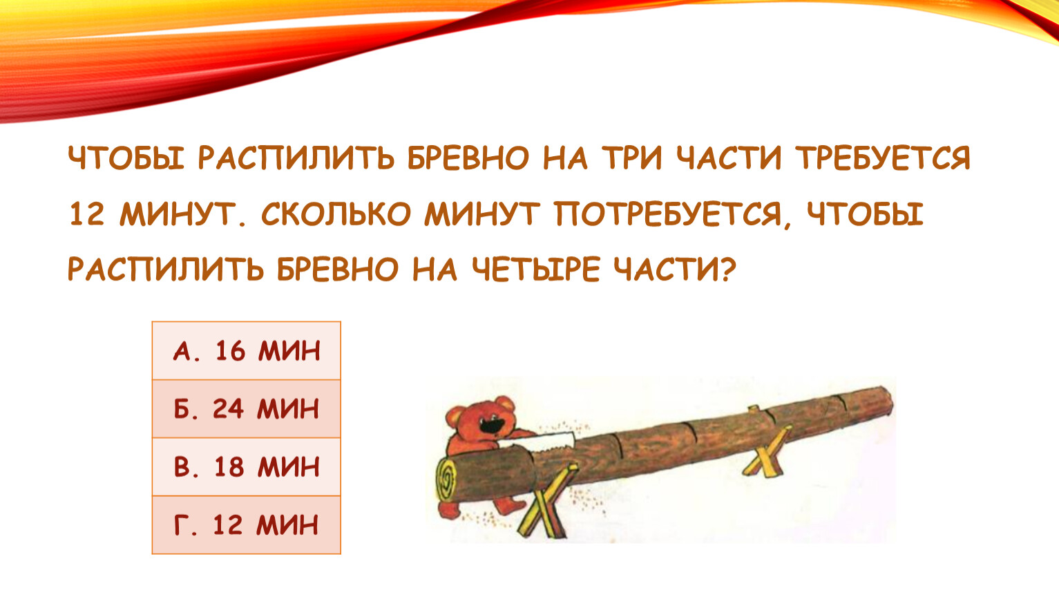 Чтобы распилить бревно на ТРИ части требуется 12 минут. Сколько минут потребуется, чтобы распилить бревно на ЧЕТЫРЕ части?
