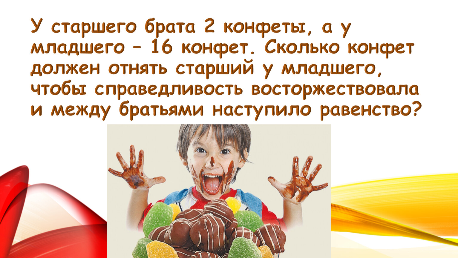У старшего брата 2 конфеты, а у младшего – 16 конфет. Сколько конфет должен отнять старший у младшего, чтобы справедливость восторжествовала и между братьями наступило равенство?