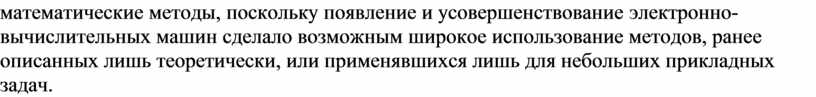 Кроме того, экономические системы развиваются и усложняются сами, изменяется их структура, а иногда и содержание, обусловленное научно-техническим прогрессом. Это делает устаревшими многие методы, применявшиеся ранее, или требует их корректировки. В то же время научно-технический прогресс влияет и на сами математические методы, поскольку появление и усовершенствование электронно-вычислительных машин сделало возможным широкое использование методов, ранее описанных лишь теоретически, или применявшихся лишь для небольших прикладных задач.
