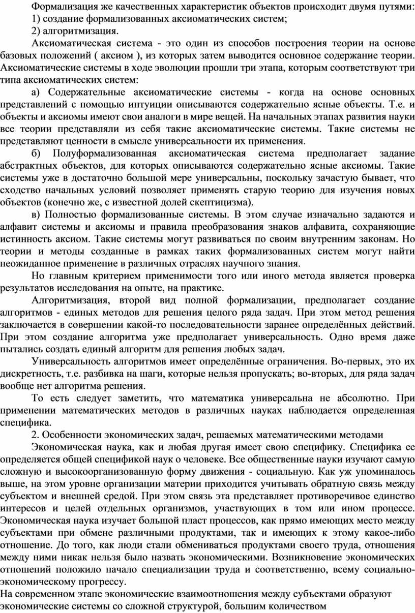 в) Полностью формализованные системы. В этом случае изначально задаются и алфавит системы и аксиомы и правила преобразования знаков алфавита, сохраняющие истинность аксиом. Такие системы могут развиваться по своим внутренним законам. Но теории и методы созданные в рамках таких формализованных систем могут найти неожиданное применение в различных отраслях научного знания.