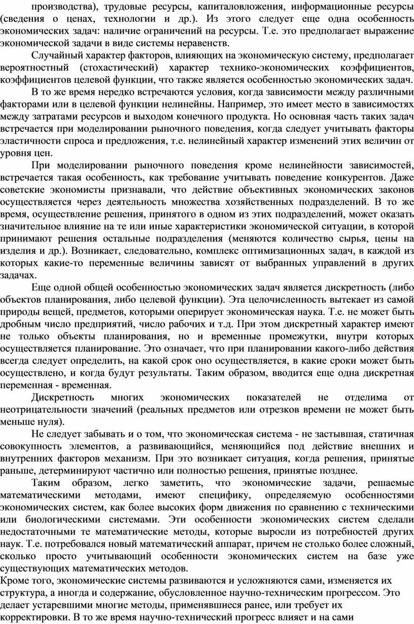 Таким образом, легко заметить, что экономические задачи, решаемые математическими методами, имеют специфику, определяемую особенностями экономических систем, как более высоких форм движения по сравнению с техническими или биологическими системами. Эти особенности экономических систем сделали недостаточными те математические методы, которые выросли из потребностей других наук. Т.е. потребовался новый математический аппарат, причем не столько более сложный, сколько просто учитывающий особенности экономических систем на базе уже существующих математических методов.
