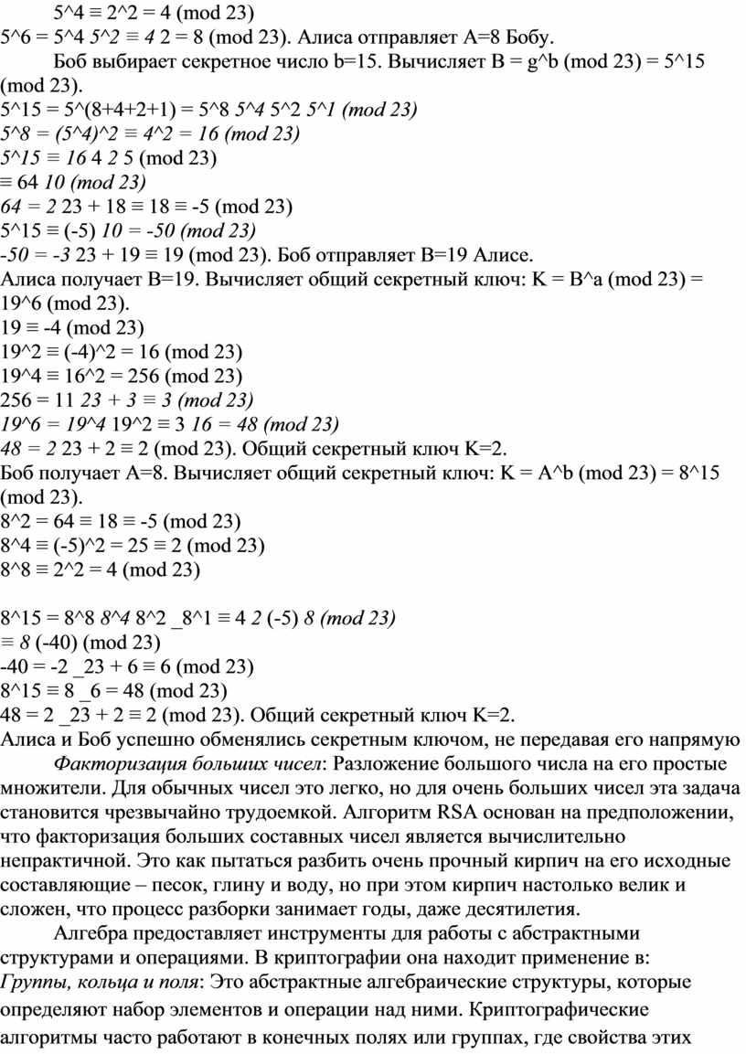 5^6 = 5^4 5^2 ≡ 4 2 = 8 (mod 23). Алиса отправляет A=8 Бобу.
