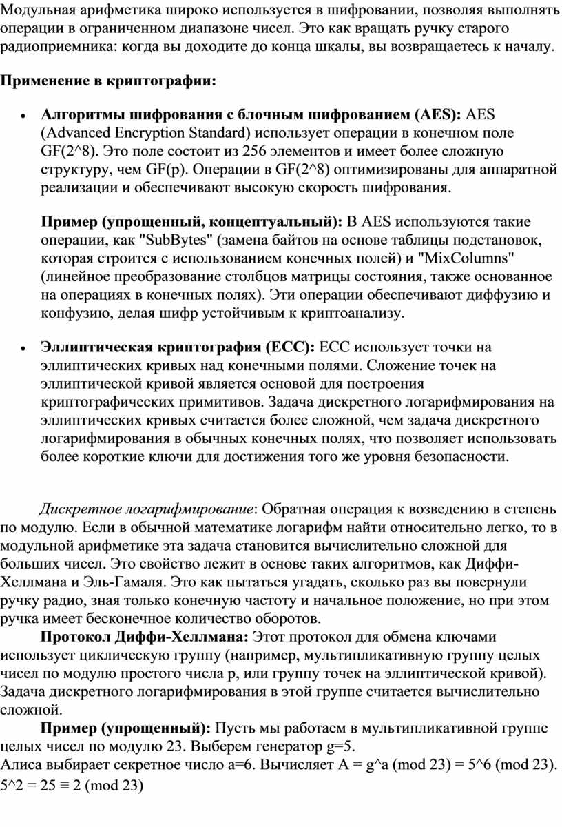 Модульная арифметика: Арифметика по модулю, также известная как "часовая арифметика", является фундаментальным инструментом в криптографии. Она оперирует остатками от деления. Основная операция – взятие остатка от деления на некоторое число n, называемое модулем. Обозначается как a(modn).