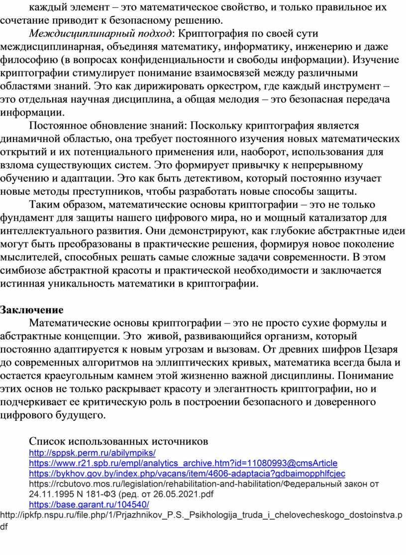 Что делает математические основы криптографии по-настоящему уникальными? Это не просто применение существующих математических теорий, а скорее создание новых математических задач и поиск их решений, которые специально разработаны для обеспечения безопасности. Криптография – это своего рода "Математический Дзен", где гармония и баланс между простотой выполнения операций и сложностью их обращения являются ключом к успеху.