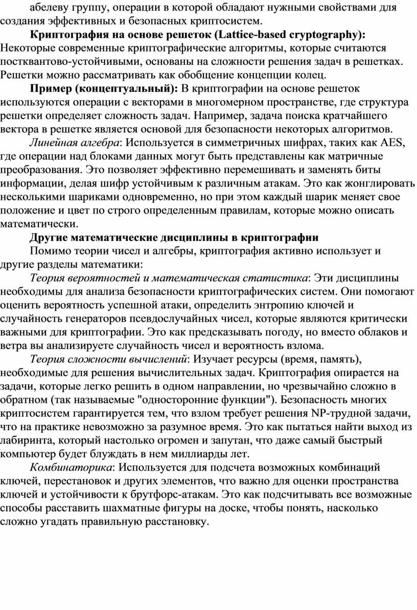 Пример (концептуальный): В криптографии на основе решеток используются операции с векторами в многомерном пространстве, где структура решетки определяет сложность задач. Например, задача поиска кратчайшего вектора в решетке является основой для безопасности некоторых алгоритмов.