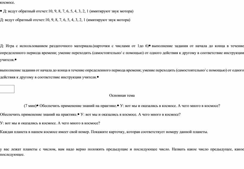 У: Давайте представим, что мы садимся в ракету, готовимся к полету, пристегиваем ремни безопасности. Ведем обратный отсчет времени к пуску ракеты