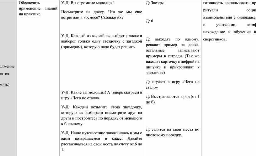 Д: выходят по одному, решают пример на доске, остальные записывают примеры в тетради. (Так же находят карточку с цифрой на липучке и прикрепляют к звездочке) Д: играют в игру «Чего не стало» Д: Выстраиваются в ряд (от 1 до 6).