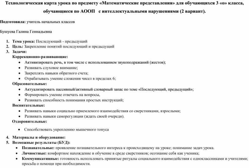 Технологическая карта урока по предмету «Математические представления» для обучающихся 3 «о» класса, обучающиеся по АООП с интеллектуальными нарушениями (2 вариант).