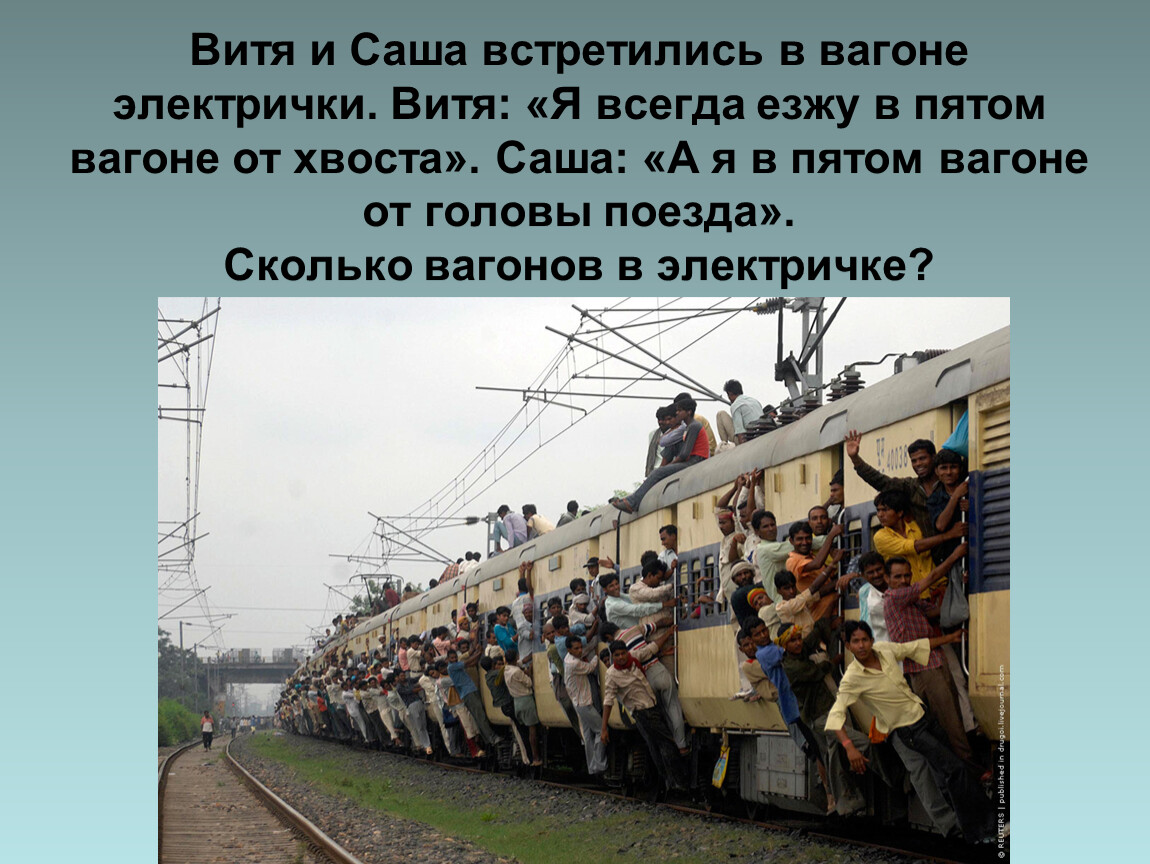 Витя и Саша встретились в вагоне электрички. Витя: «Я всегда езжу в пятом вагоне от хвоста». Саша: «А я в пятом вагоне от головы поезда». Сколько вагонов в электричке?