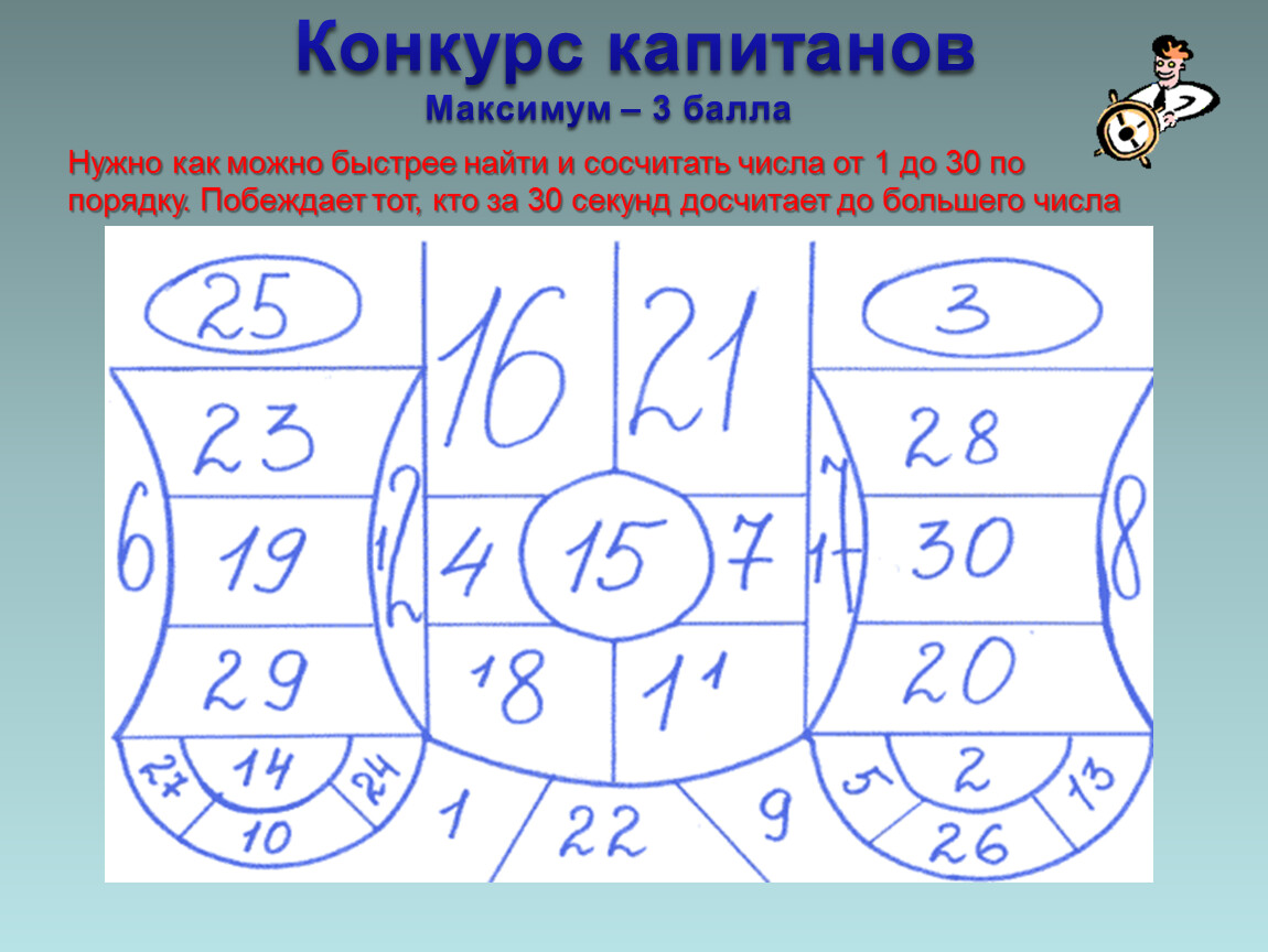 Нужно как можно быстрее найти и сосчитать числа от 1 до 30 по порядку. Побеждает тот, кто за 30 секунд досчитает до большего числа
