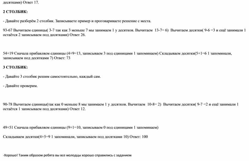 посмотрите задание 1 в учебнике. -Прочитайте задание сначала про себя а потом вслух Прочитай его вслух? -Что нам нужно сделать? -Мы с вами уже решали примеры в столбик. Скажите как мы записываем пример в столбик? 1 СТОЛБИК: - Правильно! Кто хочет решить первый пример у доски? (вызываю ученика) .А остальные записывают пример в тетрадях. -Напомни с чего мы начинаем решение в столбик? -Единицы мы пишем под единицами, а десятки под десятками. Начинаем вычислять с единиц. 75+16 Сначала прибавляем единицы (5+6=11, записываем 1 под единицами 1 запоминаем) Складываем десятки(7+1=8 1 запоминали, записываем под десятками 9) Ответ: 91 - Молодец! Присаживайся. Следующий пример идёт решать …. 82-65 Вычитаем единицы( 2-5 так как 2 меньше 5 мы занимаем 1 у десятков. Вычитаем 12-5= 7) Вычитаем десятки( 8-6 =2 и ещё занимали 1 остаётся 1 записываем под десятками) Ответ 17. 2 СТОЛБИК: - Давайте разберём 2 столбик. Записываете пример и проговариваете решение с места. 93-67 Вычитаем единицы( 3-7 так как 3 меньше 7 мы занимаем 1 у десятков. Вычитаем 13-7= 6) Вычитаем десятки( 9-6 =3 и ещё занимали 1 остаётся 2 записываем под десятками) Ответ 26.